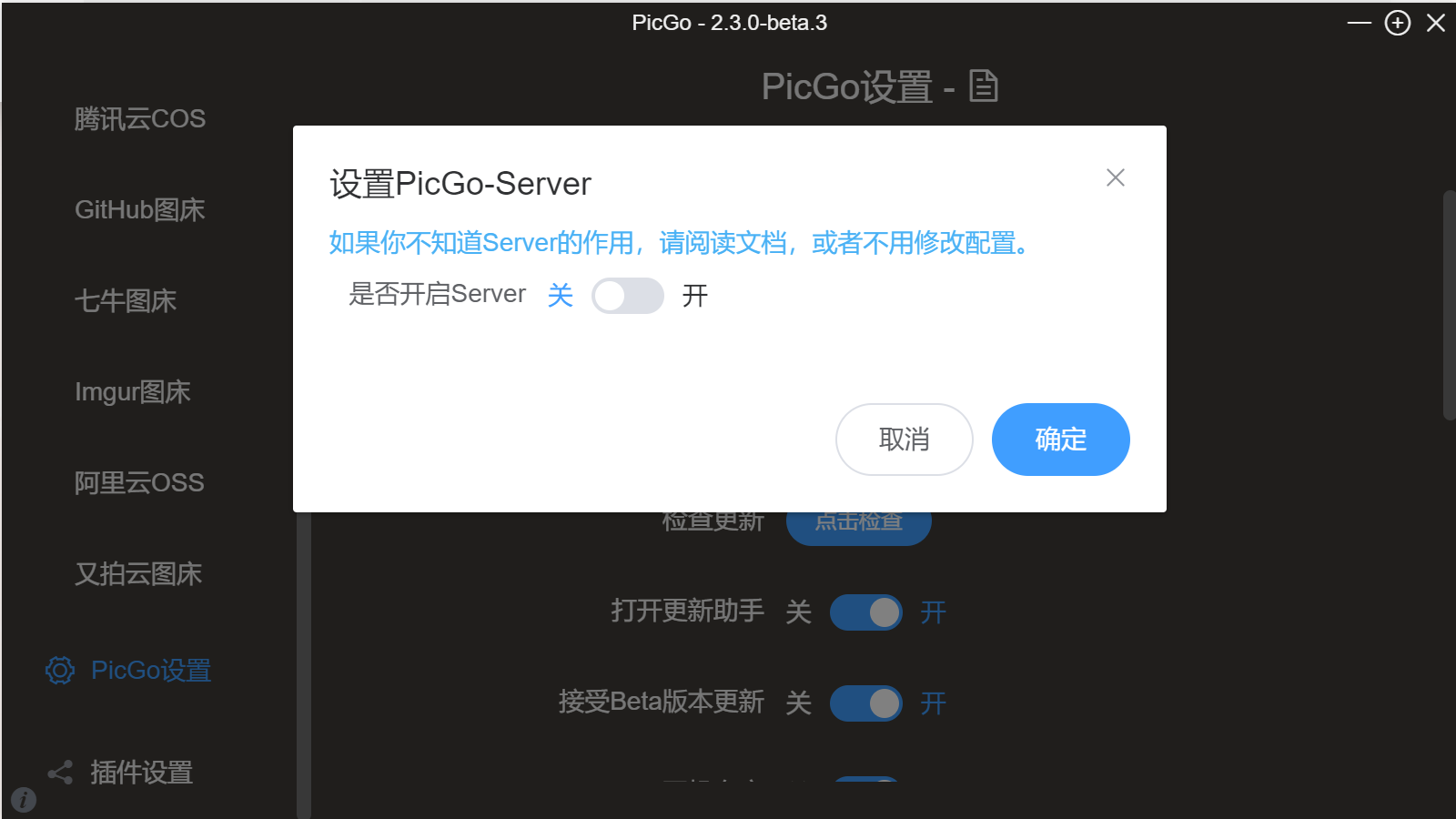 进入PicGo设置,找到设置Server,并选择关闭