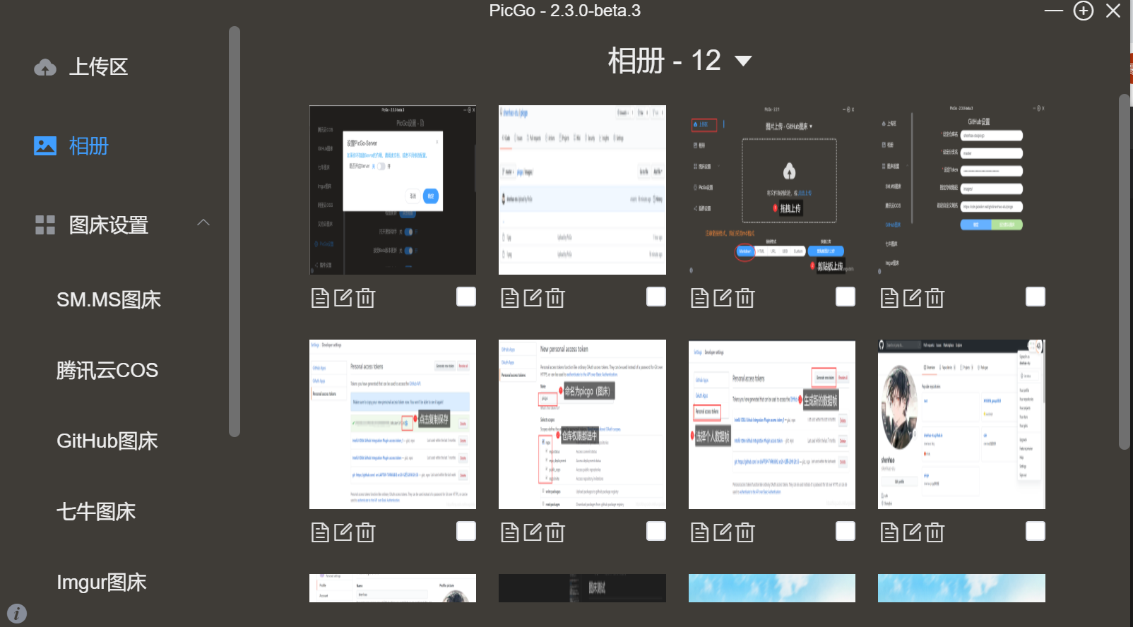 上传后,云端图片显示:使用方法:选择相册,可复制、修改链接、删除图片(不能删除github上的图片,需要手动删除):