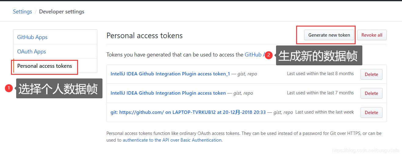 3.选择个人数据帧Personal access tokens,生成新的数据帧 Generate new token