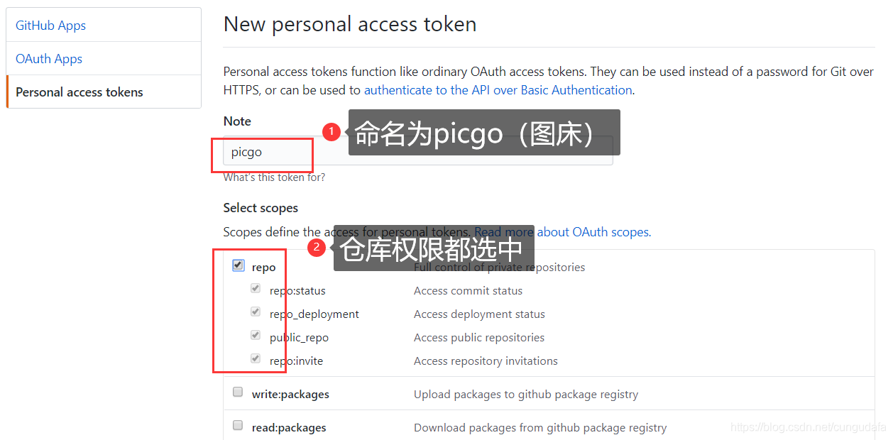4.命名为picgo(图床),赋予仓库权限