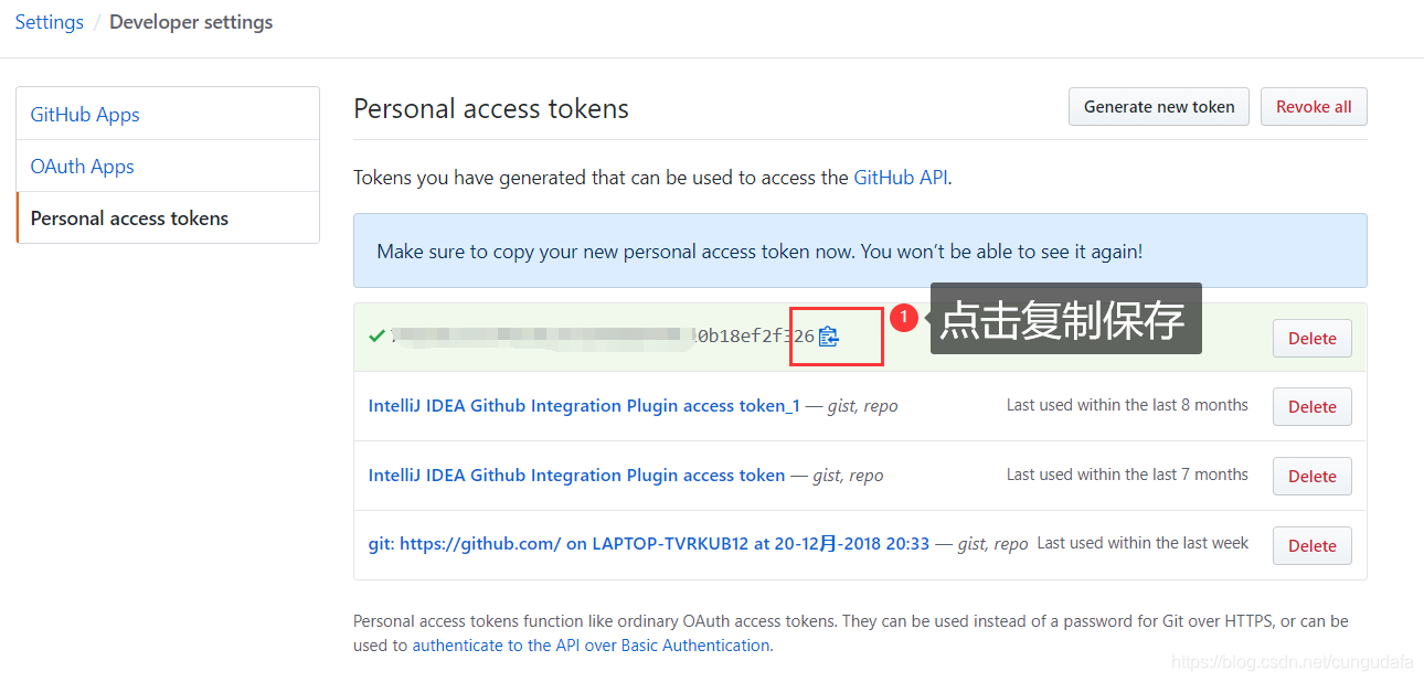 5.最后点击Generate token即可看到显示的token页面,它只会显示一次,关闭页面后再打开这个页面就不会显示了。 复制token值粘贴到文本文档中,先保存下来,后面配置PicGo要用到。