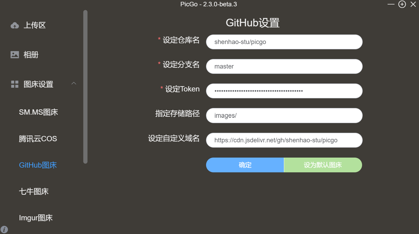 - username为GitHub用户名,repo为新建的仓库,用于存储图片